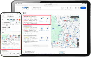 Googleマップ検索(左の画像)においても、常に上位に表示される状態を維持しています。